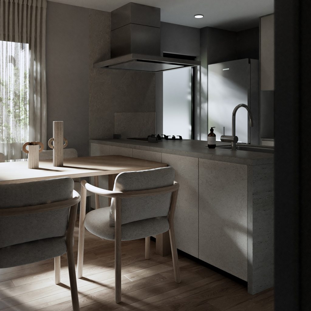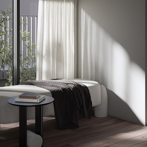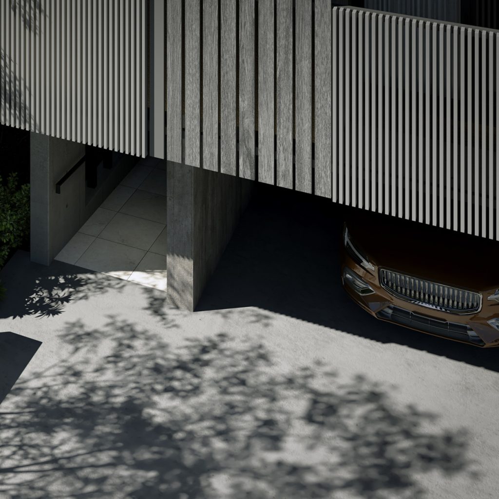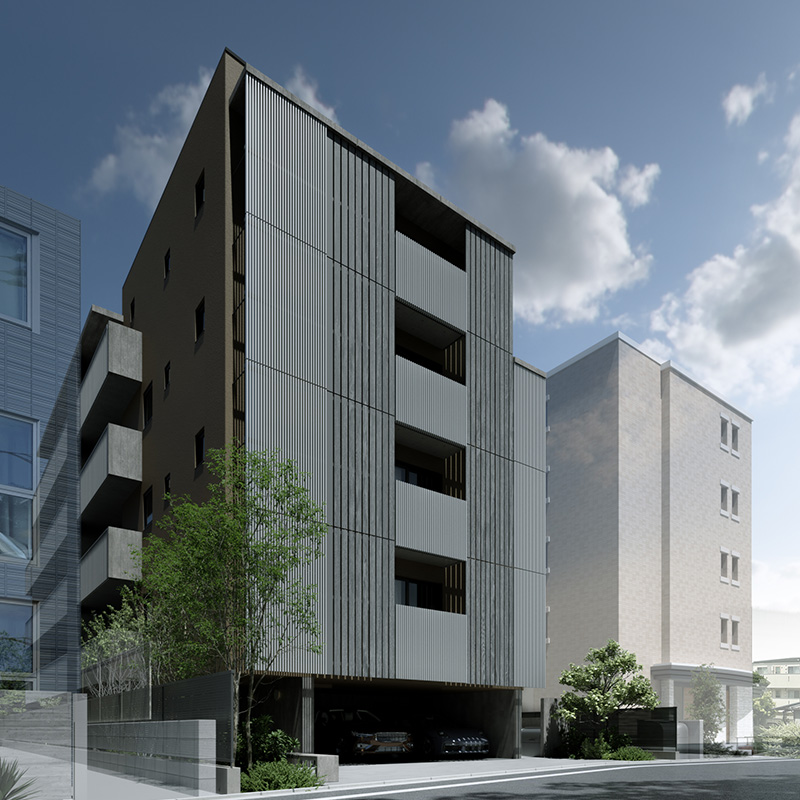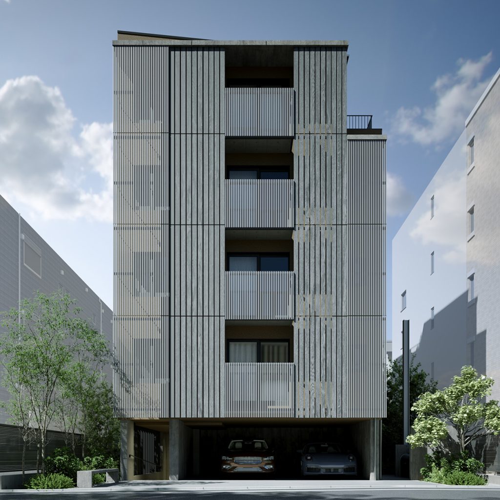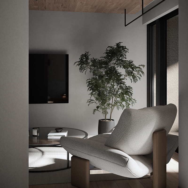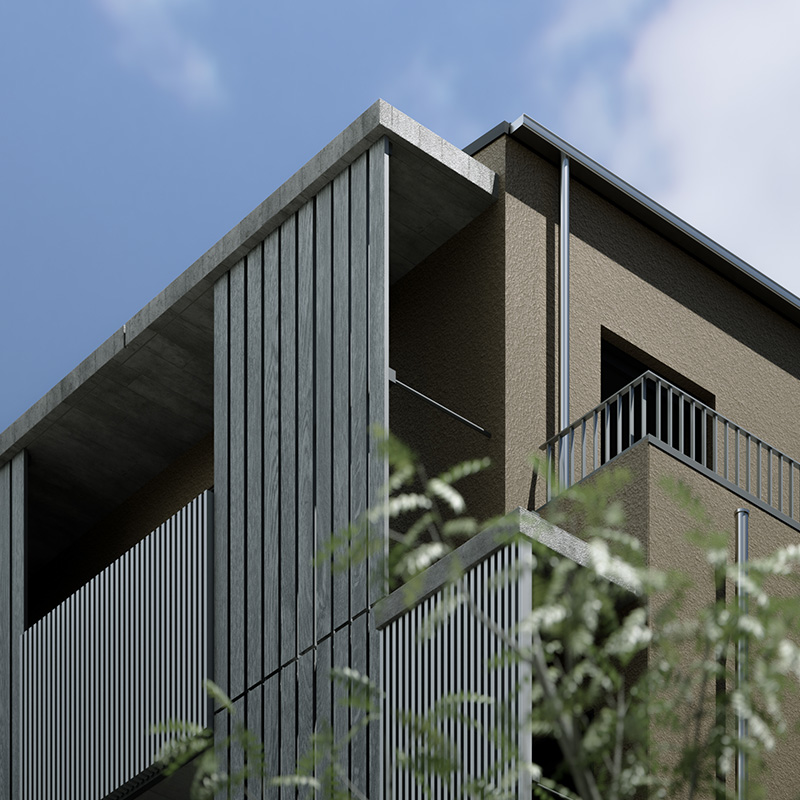 直方体のシンプルな建物を、3つの住戸ブロックに分けて配置。 それぞれの住戸が自然と接続されるようにデザインされ、光、風、緑を受け入れる。 機能と詩情が共存する、静かな構造の対話。