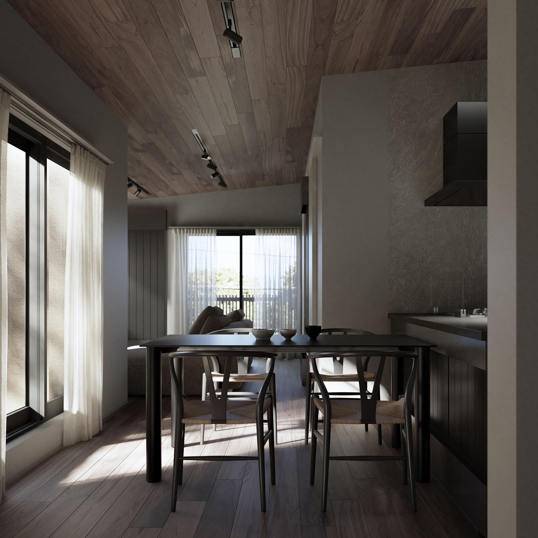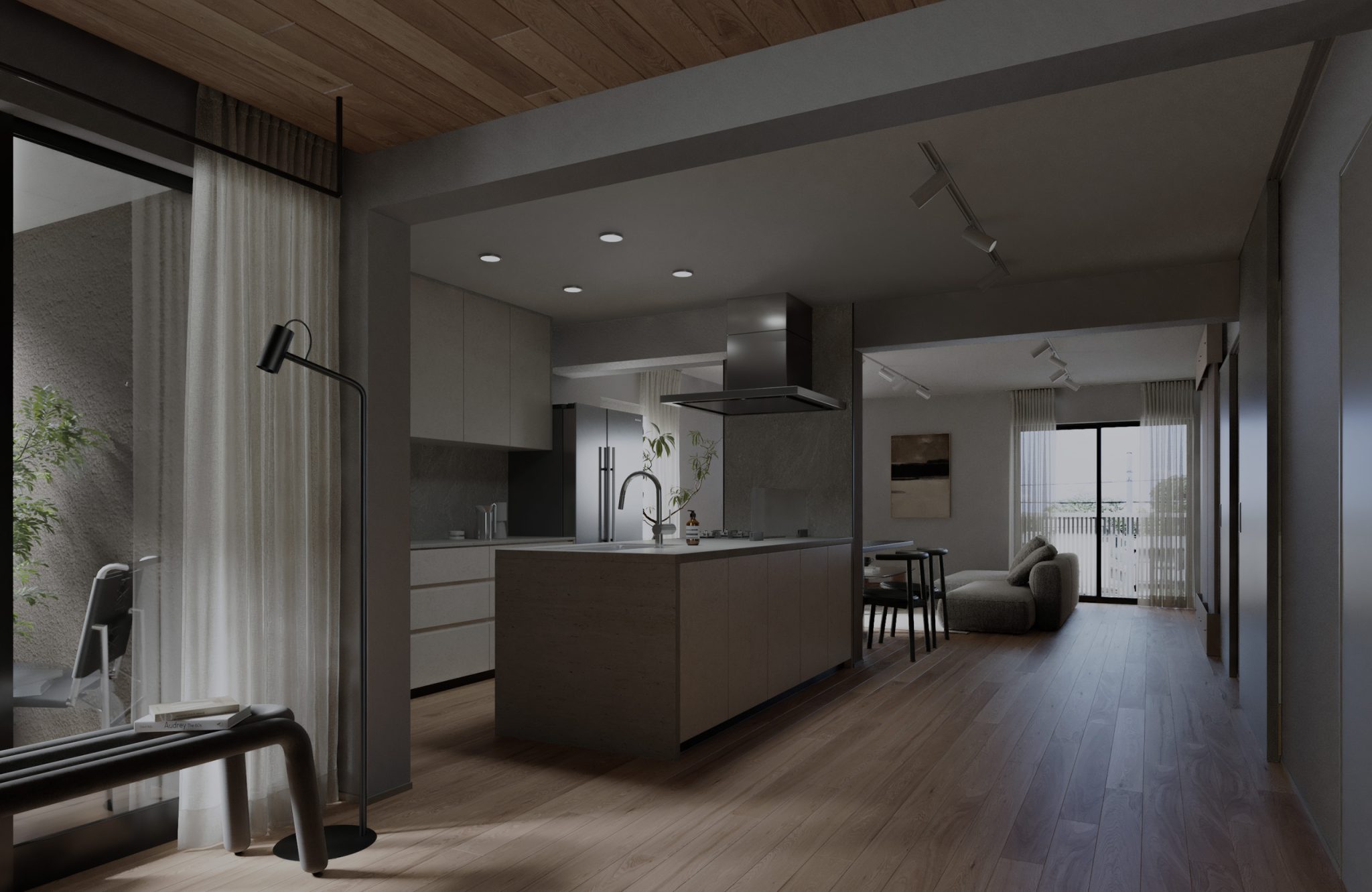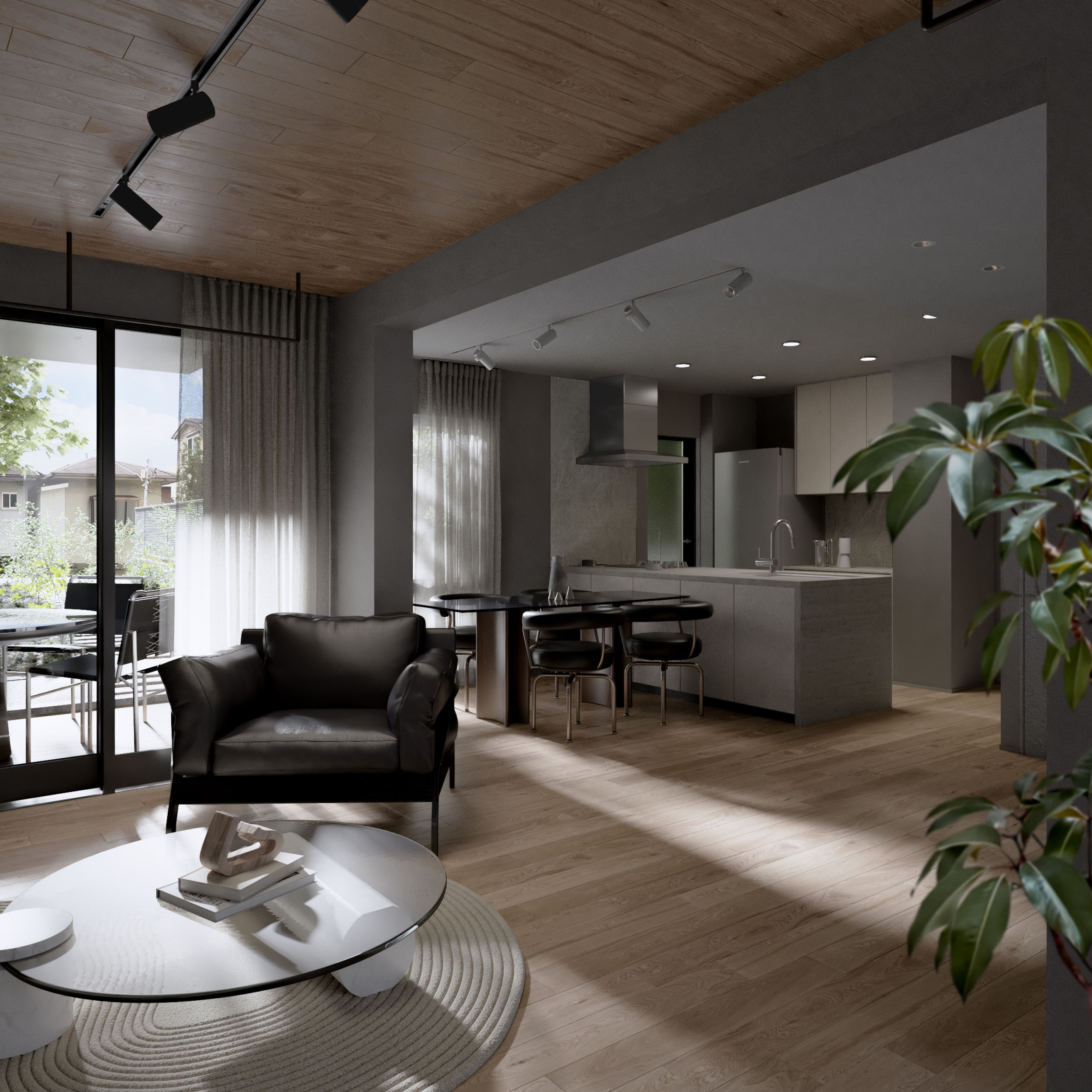 玄関から土間、そしてバルコニーへと、ひとつながりの柔らかな移ろい。 光と風、そして緑が流れ込むこの中間領域が、暮らしに呼吸をもたらす。 外でも内でもない、心地よい「間」がここにある。