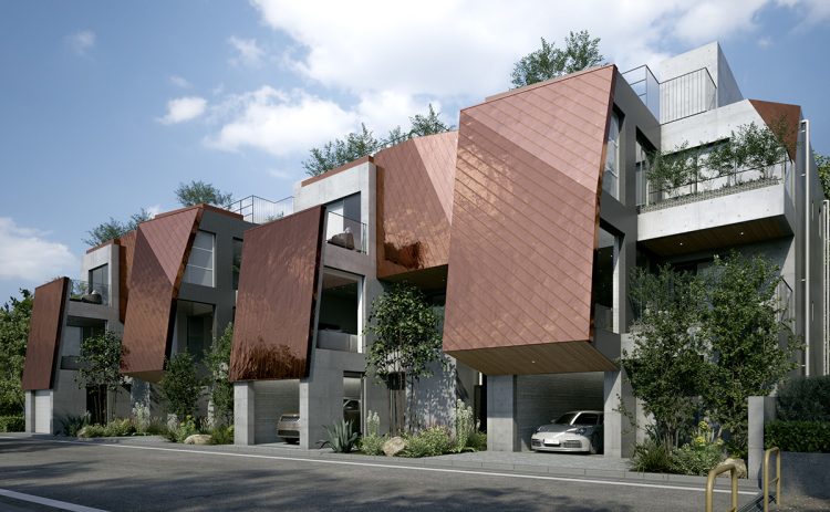 THE GRANHAUS HANEGIの各棟は、勾配屋根状の銅板壁面でゆるやかにつながっています。小川氏の真骨頂は、その「つなぎ方」にあります。各棟の間に植栽をランダムに配置し、建物の高さや奥行きに微妙な変化をつけ、道のり全体に起伏とリズムを生み出しました。季節ごとに表情を変える。音楽のような街並みです。