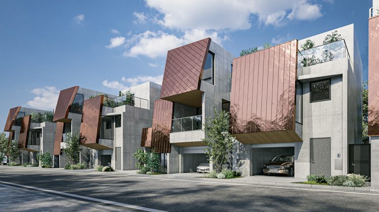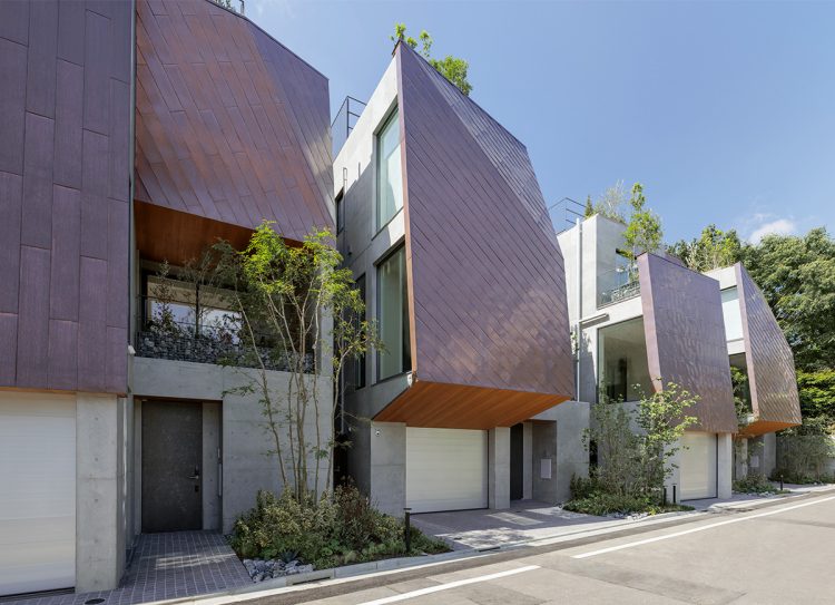 一つ目は小田急線の世田谷代田駅から歩いて6分。静かな住宅街に、連なる4棟の戸建て群「THE GRANHAUS HANEGI」が新しい街並みを形成しています。この場所を訪れてまず目に入るのは、建物を包み込むような豊かな緑です。各棟の前庭から中庭、そして屋上まで、立体的に配された植栽が、まるでひとつの森のような景観を創り出しています。西側には羽根木公園の緑地が広がり、都心とは思えない自然豊かな環境です。