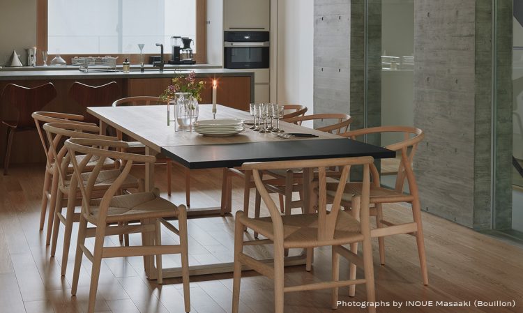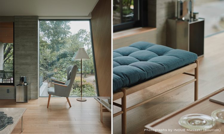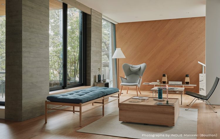 リビングスペースには、北欧デザインの巨匠 ハンス・J・ウェグナーのイージーチェアを配置。読書や音楽鑑賞のための特等席として、窓からの自然光が差し込む絶好のポジションに置かれています。オットマンと合わせることで、よりリラックスした時間を過ごせる提案となっています。