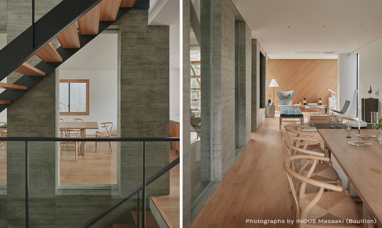 2階のリビングダイニングは、吹き抜けを介して1階と縦にゆるやかにつながります。杉板の木目を映したコンクリート柱が上下階を貫き、その間からプライベートテラスの緑が覗きます。内と外、上と下の境界を曖昧にした開放的な設計。従来の画一的な箱型LDKとは異なる、ダイナミックな空間体験がここにあります。