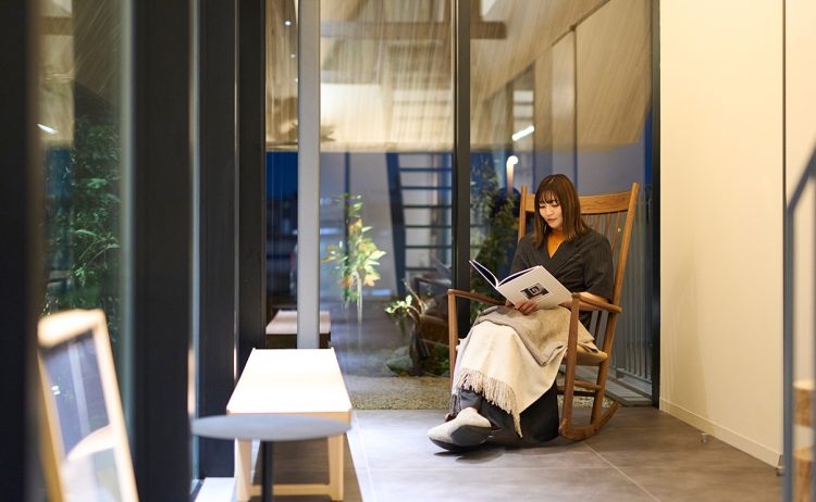 「この敷地の長さを活かして、日常から住まいへ切り替えるための距離として設計しました」と蜂谷。都心の賃貸住宅でこれほど贅沢に「間(ま)」を設けた物件は稀だろう。しかしこの物理的な距離こそが、現代人に必要な「スイッチを切る装置」なのだと蜂谷は言う。