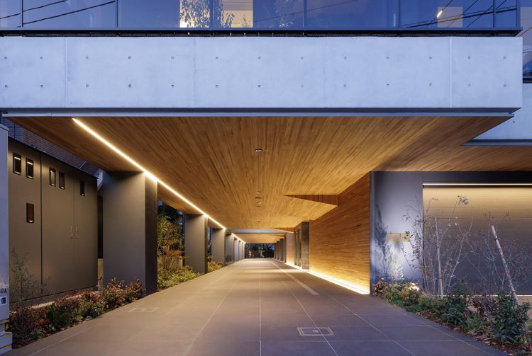 対談の舞台となった、THE GRANDUO YOGAの最大の特徴は、道路からエントランスまで続く約50メートルのアプローチだ。板張りの軒天、足元を照らすライン照明。歩を進めるごとに、外界の喧騒が遠のいていく設計になっている。
