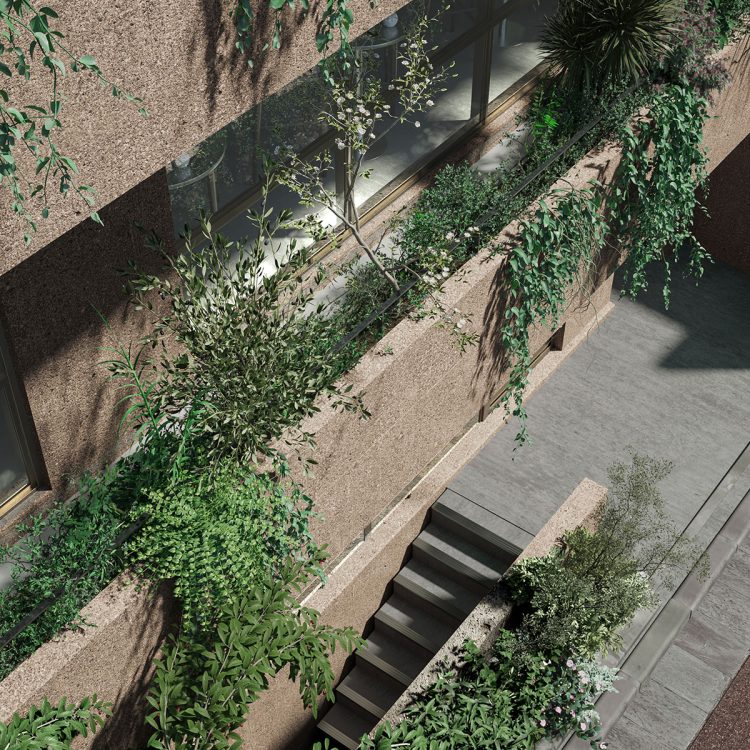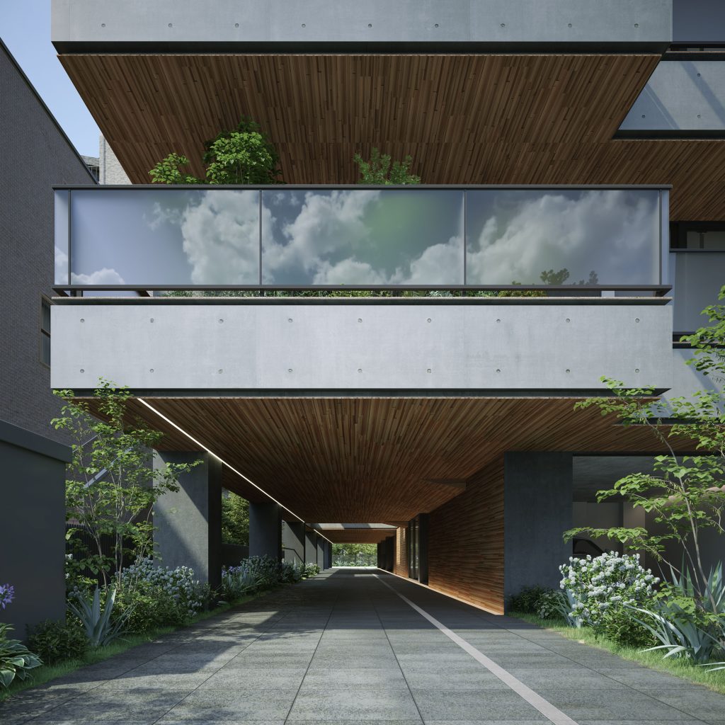 奥行50/幅12mの敷地特性が生んだメインエントランス。